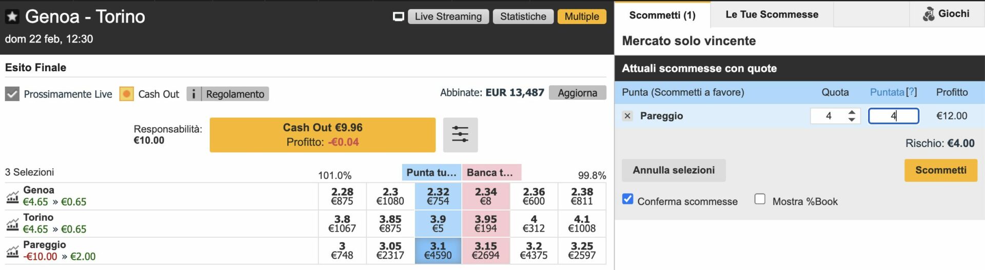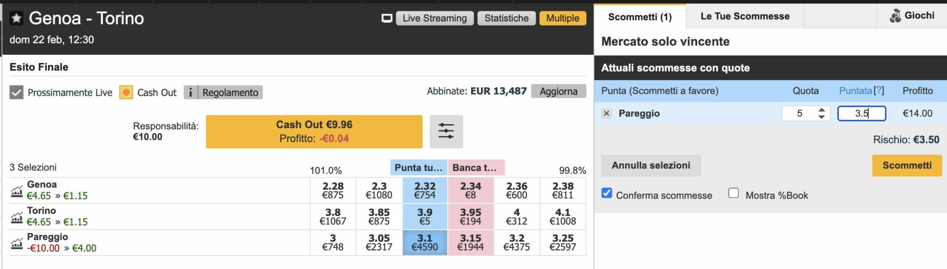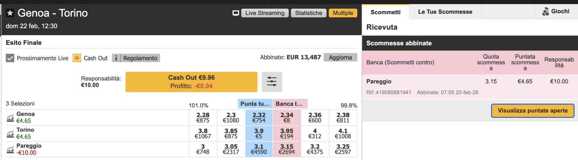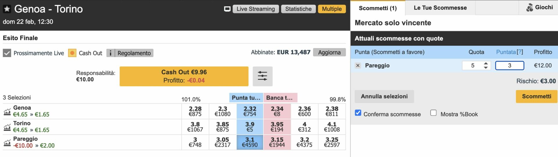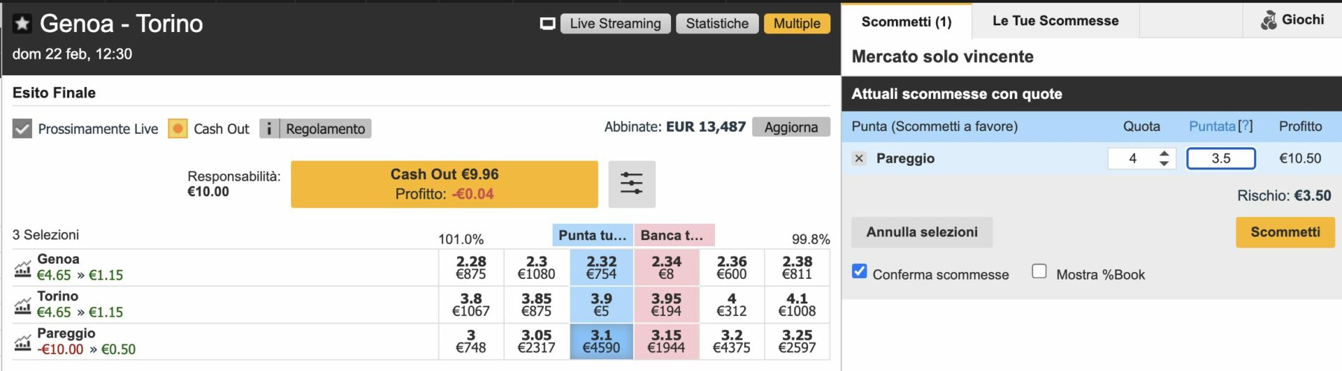 La partita che mi è capitata sotto mano è Genoa-Torino, come è possibile vedere abbiamo un Banca X a 3.15.
